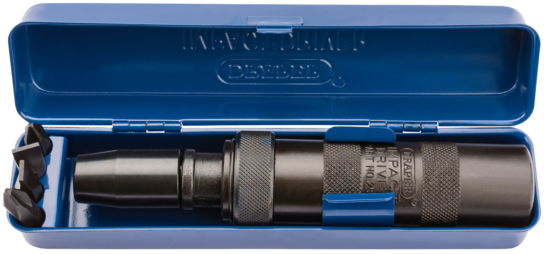 With forward/reverse rotation and chemically blacked knurled hand grip. Supplied with bit holder and four bits. Bit holder can be removed to use 1/2″ socket drive with impact sockets. Overall tool length 170mm. Display packed in steel storage case.