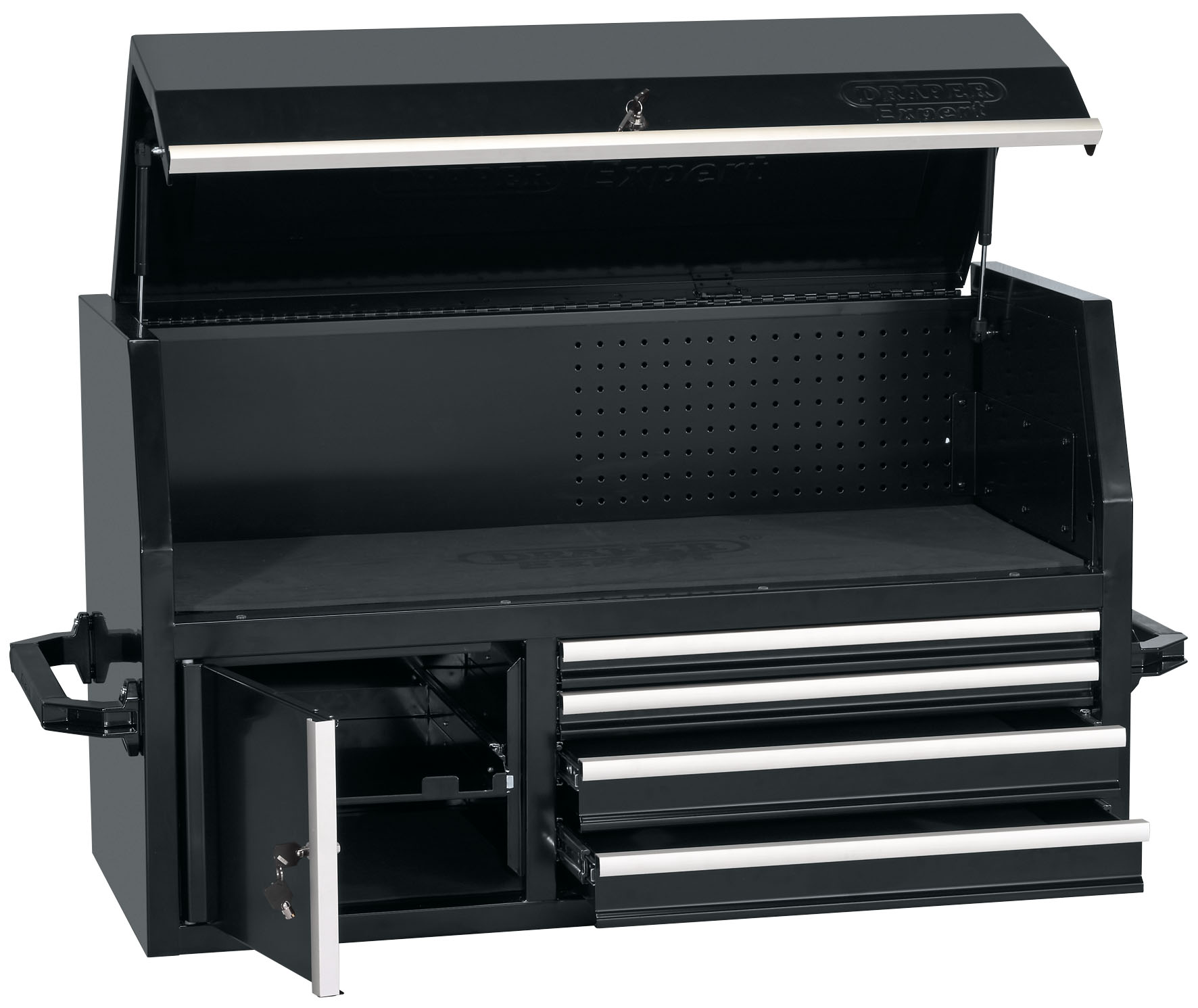Expert Quality, four drawer roller cabinet, fitted with fixed and braked swivelling castors and soft grip handles for easy manoeuvrability. Manufactured from thick sheet steel with a protective powder coated finish. Drawers are fitted with an Aluminium trim, 3mm EVA foam linings, heavy duty auto retention ball bearing runners delivering a smoother operation and a secure locking system Supplied with two keys. Each tool cabinet is also Supplied with a 6mm EVA top mat. Carton packed on pallet.